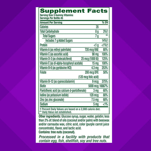 vitafusion™ Hair, Skin & Nails gummies are formulated with essential vitamins and minerals, including Biotin, to help support healthy hair, skin, and nails.* Each serving delivers nutrients to promote overall beauty and wellness.