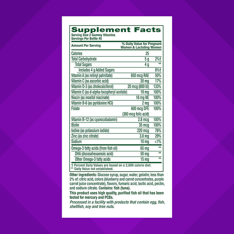 vitafusion™ Prenatal gummies provide essential vitamins and minerals for women during pregnancy.* Each serving delivers folic acid, iron, DHA, and other key nutrients to support healthy fetal development and maternal wellness.