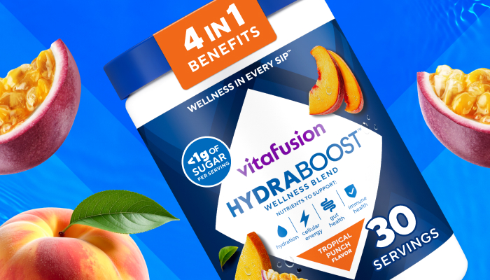 30 servings of vitafusion™ Hydraboost Wellness Blend in Tropical Punch, a wellness support drink powder that supports hydration, cellular energy, gut and immune health with 11 essential vitamins and minerals. Peach, mango, and passionfruit come together to create a Tropical Punch flavor that hits just right!