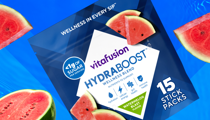 15 single-serve packets of vitafusion™ Hydraboost Wellness Blend in Watermelon Blast, a daily wellness support drink powder that supports hydration, cellular energy, gut and immune health with 11 essential vitamins and minerals. Deliciously fruity and refreshing Watermelon Blast flavor that hits just right!